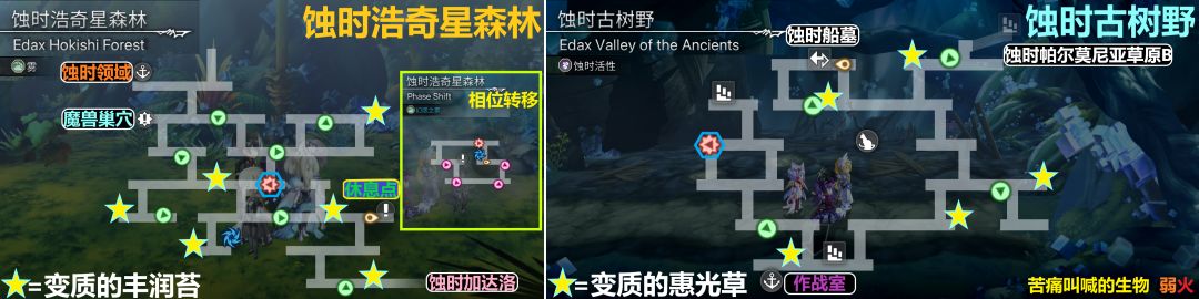 ▶闪光点素材:蚀时浩奇星森林-变质的丰润苔;蚀时古树野-变质的惠光草