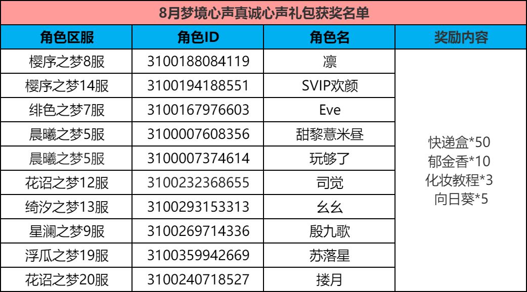 获奖名单 | 8月梦境心声反馈获奖名单公布!