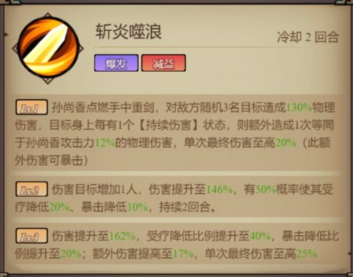 - 孙尚香「斩炎噬浪」根据持续伤害层数造成毁灭性打击