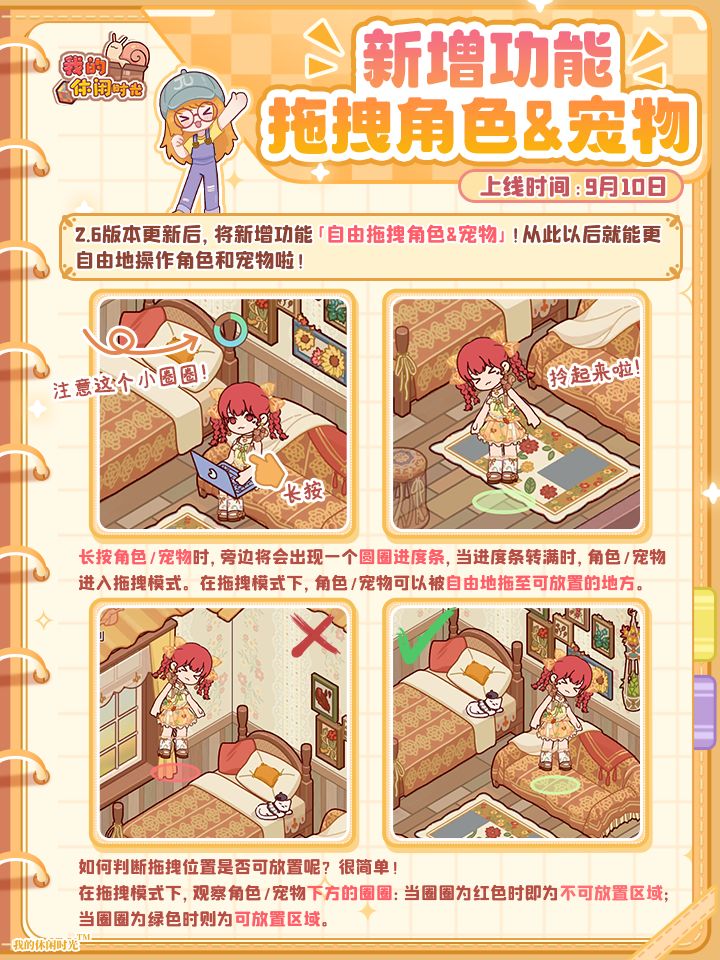 ⭐️2.6版本更新后,将新增「自由拖拽角色/宠物」功能&角色洗澡互动动作,长按角色/宠物即可自由拖拽至可放置的地方,拖至可互动家具(如沙发/床/椅子等)还会随机触发互动动作,拖至浴缸类家具还可触发全新洗澡动作!更多详情戳下图查看~