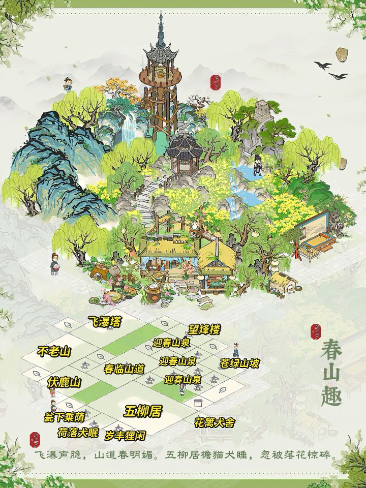 建筑:五柳居、春临山道、飞瀑塔、迎春山泉、苍绿山坡、荷落犬眠、岁丰狸闲、瓮下乘荫、花篱犬舍、不老山、伏鹿山