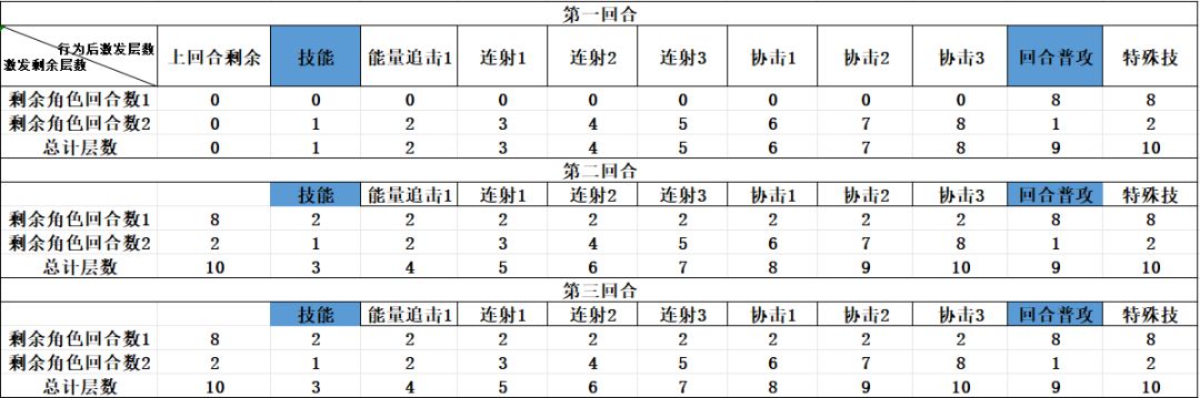 行表示光弓每次行为后激发层数,列表示激发两种剩余角色回合的数量
