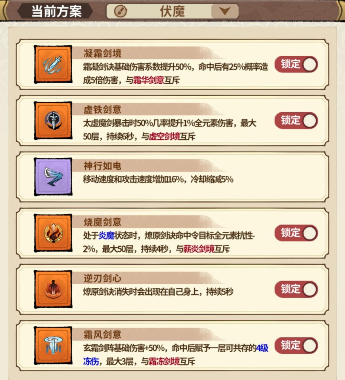 伏魔专用天赋:虚铁 凝霜 烧魔 逆刃 霜风 神行,加粗为核心天赋。霜风、神行可换其他输出类天赋,该天赋需配武器炎魔。