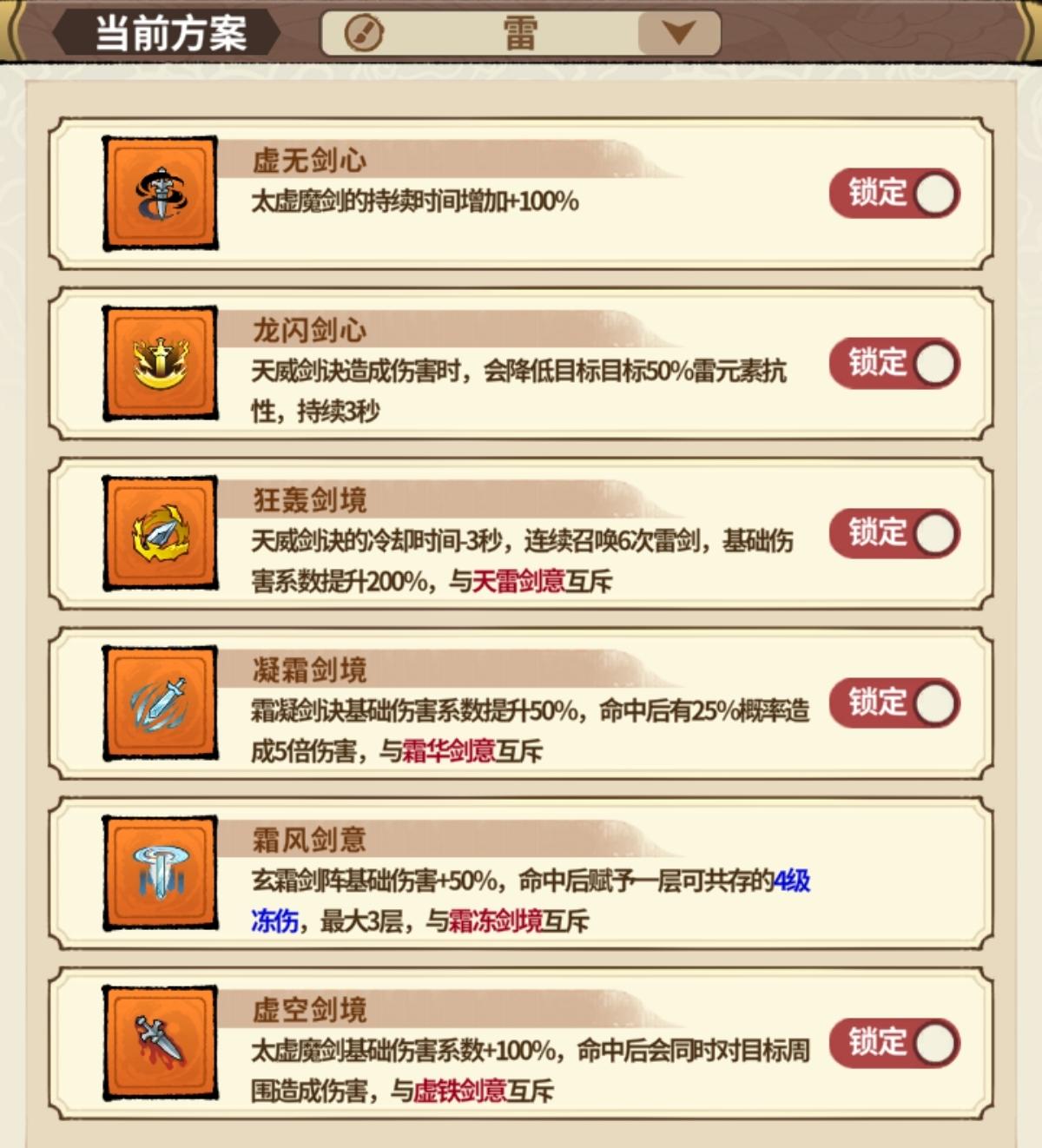 冰剑天赋:虚空 虚无 凝霜 霜风 神行 百气,加粗字体为核心天赋。虚空可换虚铁,该天赋适合伏魔、虚天殿。武器跟雷剑一样。