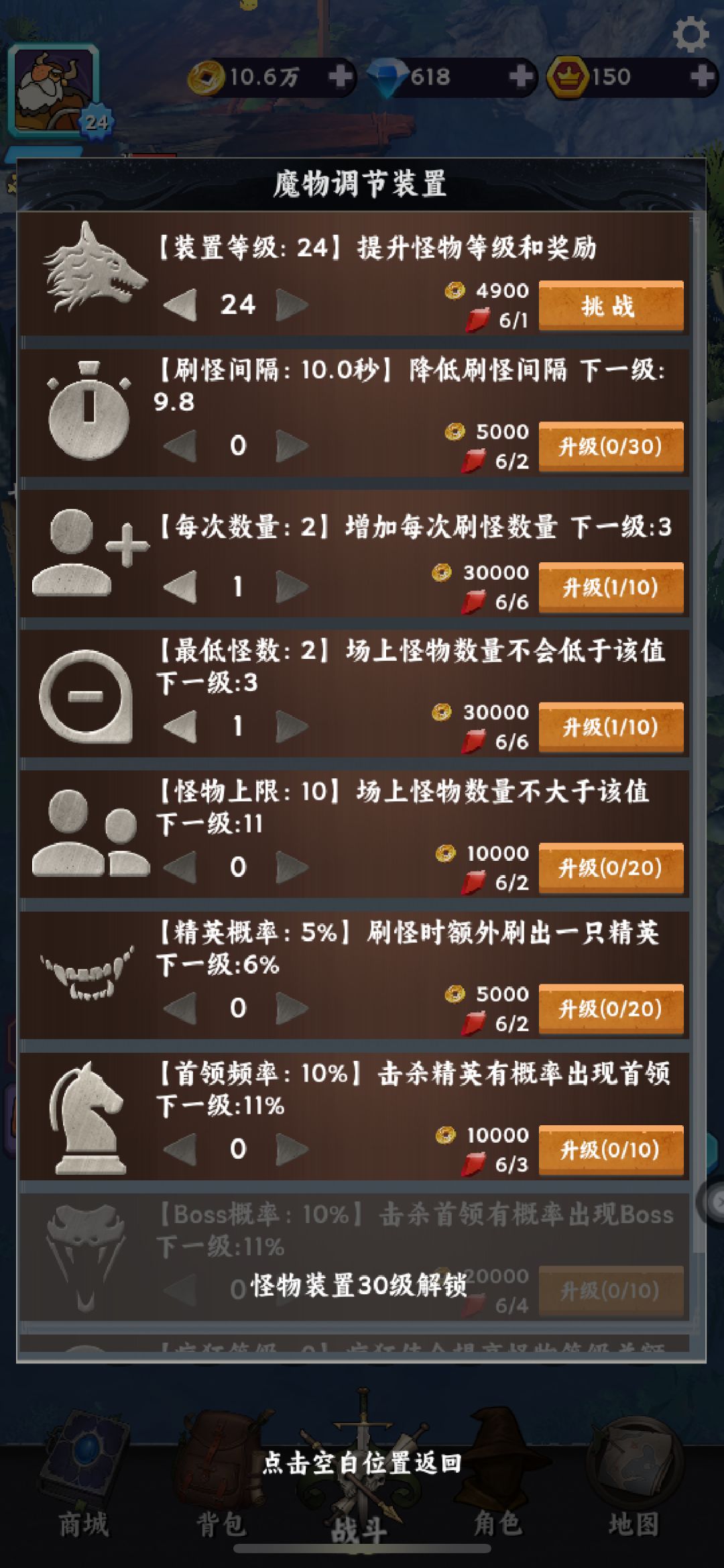 装置等级部分能打多高打多高,如果发现打不过的时候可以先进行挂机模拟,然后进行快速挂机提升等级获取装备,魔物调节装置优先每次数量与最低怪数加大怪物刷新速度。