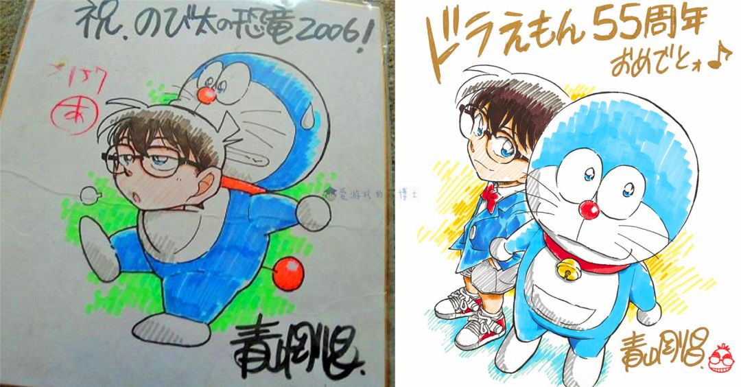 藤子·F·不二雄的经典作品《哆啦A梦》近期话题挺多,特别是今年是作品问世的55周年,官方特意公布了由《名侦探柯南》作者青山刚昌绘制的周年贺图,瞬间吸引了不少粉丝!其实,早在2006年的时候,青山刚昌也曾在《快乐快乐月刊》上绘制了《哆啦A梦:大雄的新恐龙》电影的庆祝贺图,双方也算是老朋友了。