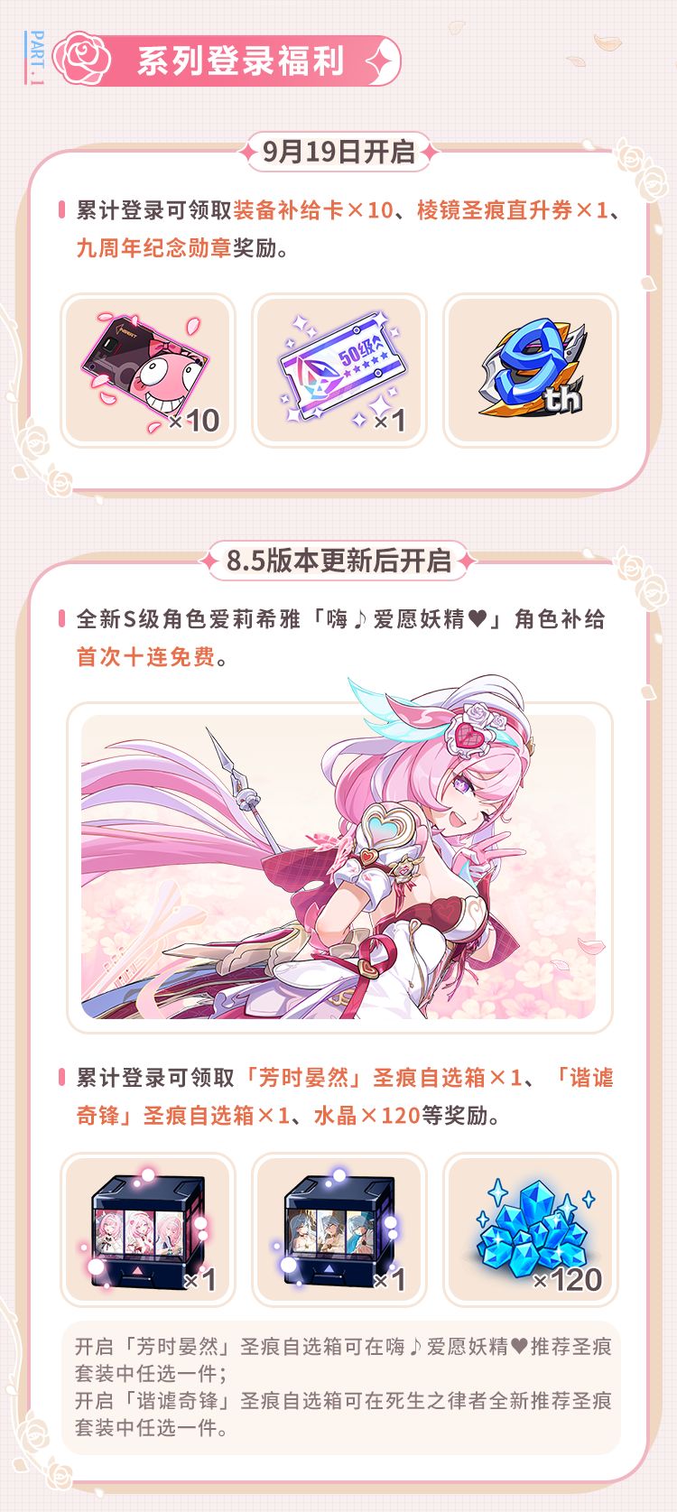 舰长好!《崩坏3》九周年庆典即将开启~今天小跟班为舰长带来8.5版本周年福利预告,快来一起看看吧!