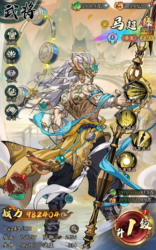 二、神光系统,后期成长无上限被动 “神・裂崖” 让神马超 ** 每次行动(含反击、追击)** 都有高概率(Lv3 达 80%)获得【神光】,层数叠加带来 “生存→输出→破防” 的阶梯式强化:1 层提升伤害减免 / 抗暴,保障站场;3 层加攻击 / 伤害加成,强化输出;6 层解锁 25% 无视防御,打穿前排;神兵 “驰骋之鸣” 强化 + 15 后,神光上限扩至 9 层,还能额外提升暴击 / 命中,彻底突破成长天花板。后期战斗时长足够,神光轻松叠满,让他从 “能打” 进化为 “打谁都痛”。