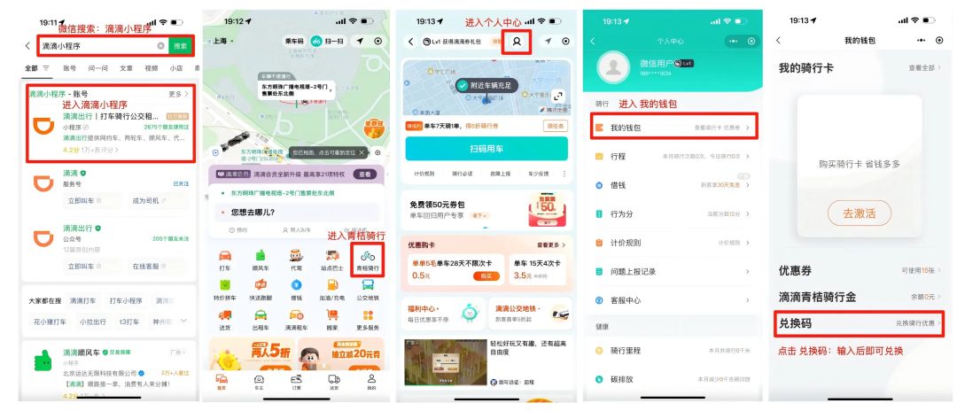 1、通过滴滴小程序/青桔小程序进入到青桔单车主页-点击进入个人中心-我的钱包-兑换码-输入相应兑换码即可兑换成功;
