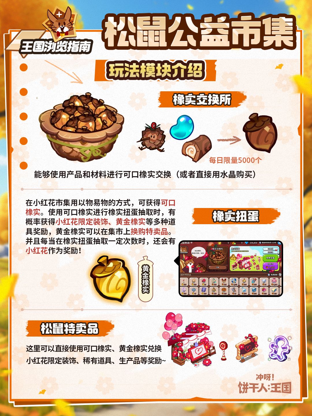 松鼠商店是不定期进驻王国的商店。活动期间,饼干朋友们可通过王国生产物兑换橡实,并使用橡实抽取/兑换松鼠商店的特卖品,其中包括限定装饰哦~