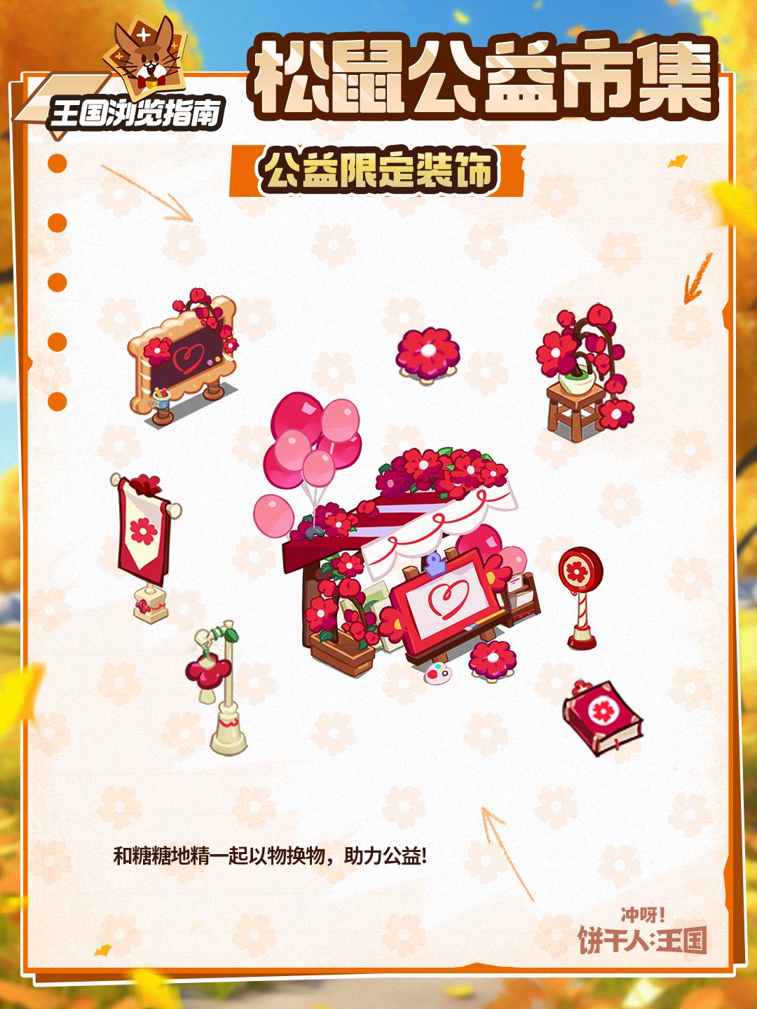 公益市集再开启,以物易物拿好礼,松鼠商店随久久公益日一同登场,本次松鼠市集(商店)限定上架小红花装饰,参与松鼠扭蛋次数时还能收获小红花,达成全服目标将通过腾讯基金会支持青少年接受艺术启蒙,快来和糖糖地精们一起以物易物做好事吧!