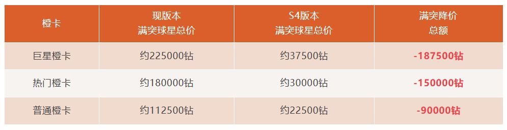 现行版本因橙卡球员获取方式多为抽卡,获得几率随机,遂以保底作为必得价值。对比S4赛季版本橙卡获取价值,降幅高达到80%。具体计算可参看以下图表: