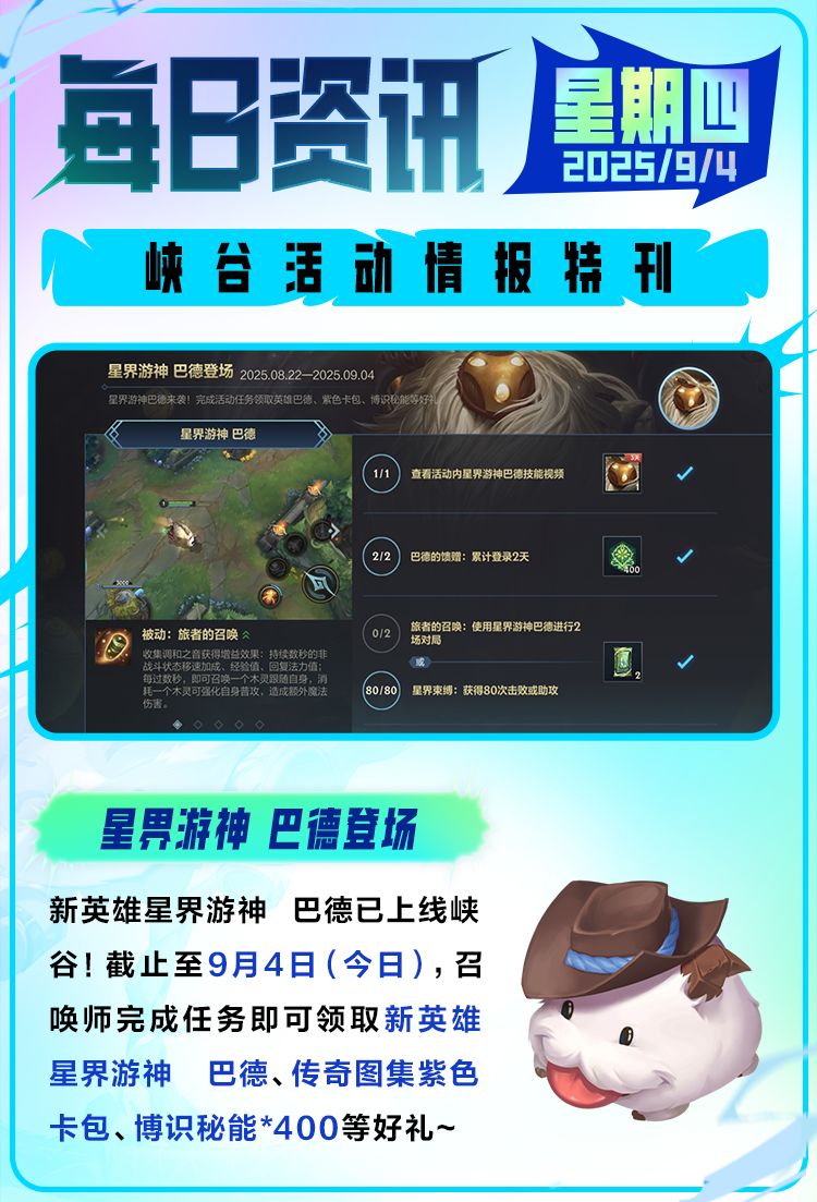 奖励:新英雄星界游神 巴德,传奇图集紫色卡包等好礼