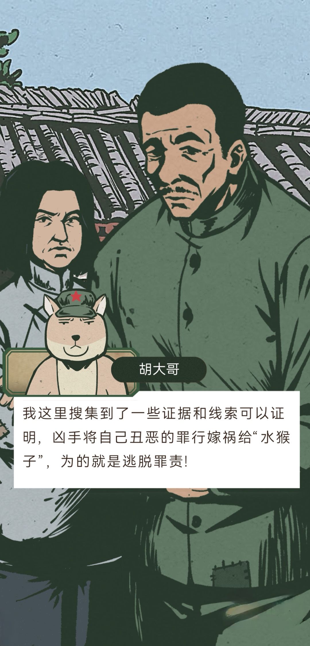 因为Taptap经常在首页推送这个游戏,所以想着最近玩一下。玩了之后感觉还不错,故事情节完善,人物性格立体,角色配音贴合人物,立绘也很有特色,就是有点短。游戏剧情以民警胡大哥的视角展开。胡大哥所在的民警队伍因为“水猴子”的传闻,不仅人被群众打,还被污名化。而发生在石坂村的一桩命案也被扣上“水猴子”杀人的帽子。胡大哥探查现场、验尸后,锁定了四名嫌疑人:王富贵、赵德昌、张春霞、陈宝家。这四人均与死者赵秀英被害一案相关联。