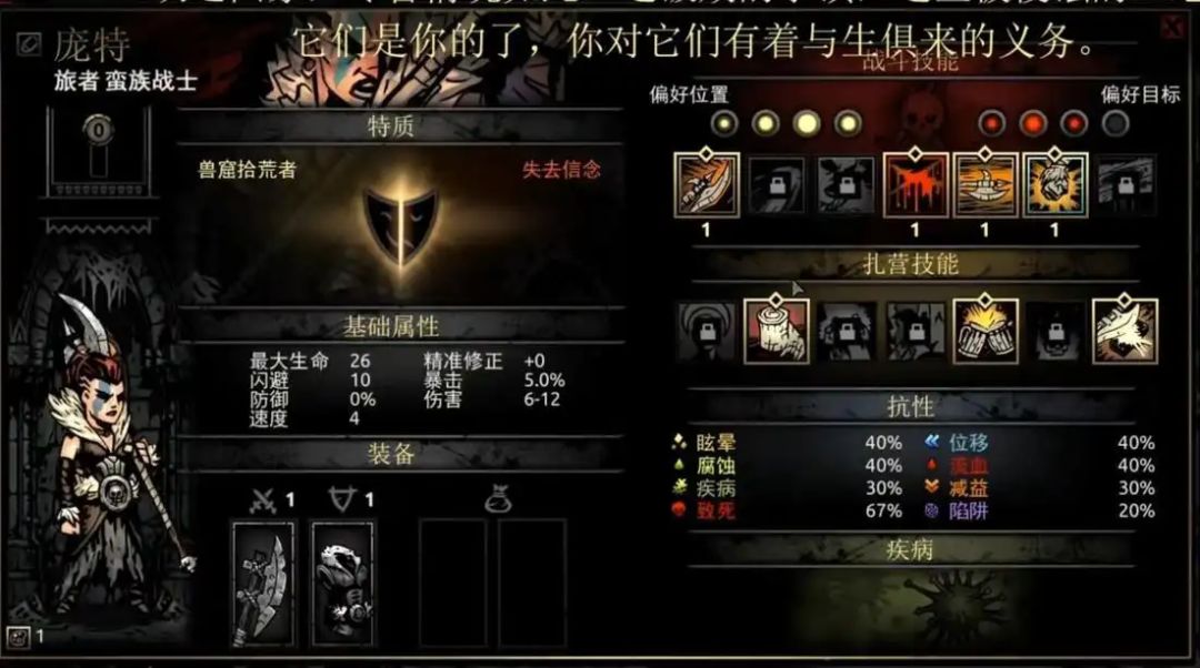 技能解析:1技能=普攻,不多做介绍。2技能钢铁天鹅暴击率高,能打4号位,打压力怪,dd3的绝佳选择。3技能前排双晕,配合瘟疫的双晕能晕4个,队伍控制不足的时候可以带它。4技能能打到2,3号位,适合补刀,上dot打高防怪。5技能冲锋防乱位。6技能是个相当不错的自奶技能,拉血线的同时还能消dot和加buff。7技能相对乏力,平时基本不用她的扎营技能“宿醉狂欢”可谓神技,只需要3点扎营点数和4个草药就能让全队-20压外加四场战斗的压力减免。7技能以3点扎营点数的代价换取四场战斗+10%的暴击率,打boss前或扎营点数有富裕可以用它。6技能则相对乏力,如果队伍带狗哥且恶女压力偏高的情况下可以使用。4技能在队伍确保不会乱位的情况下使用是很物超所值的。