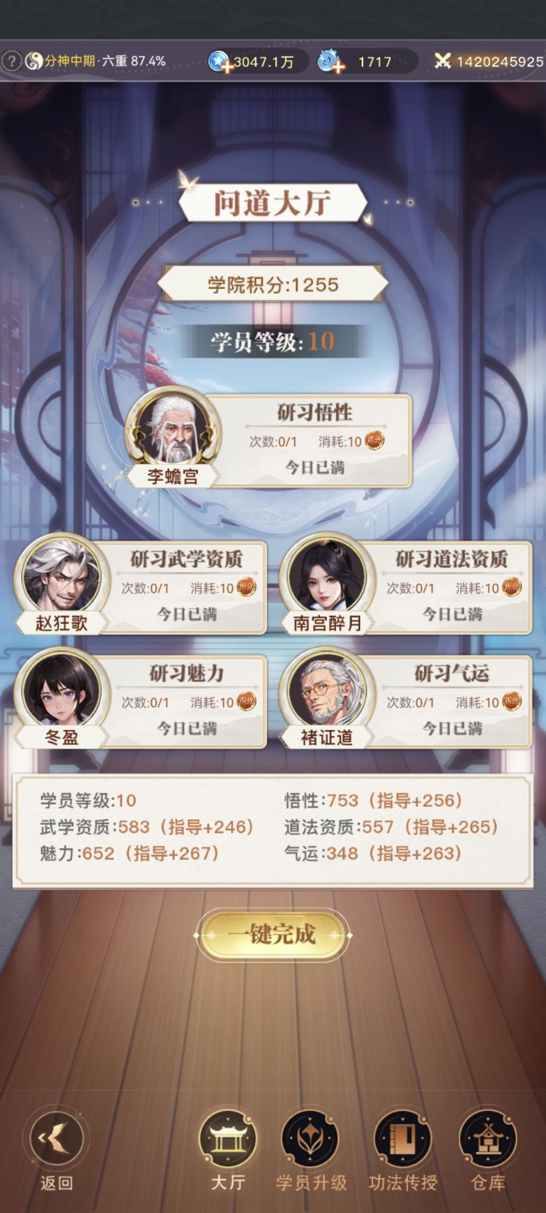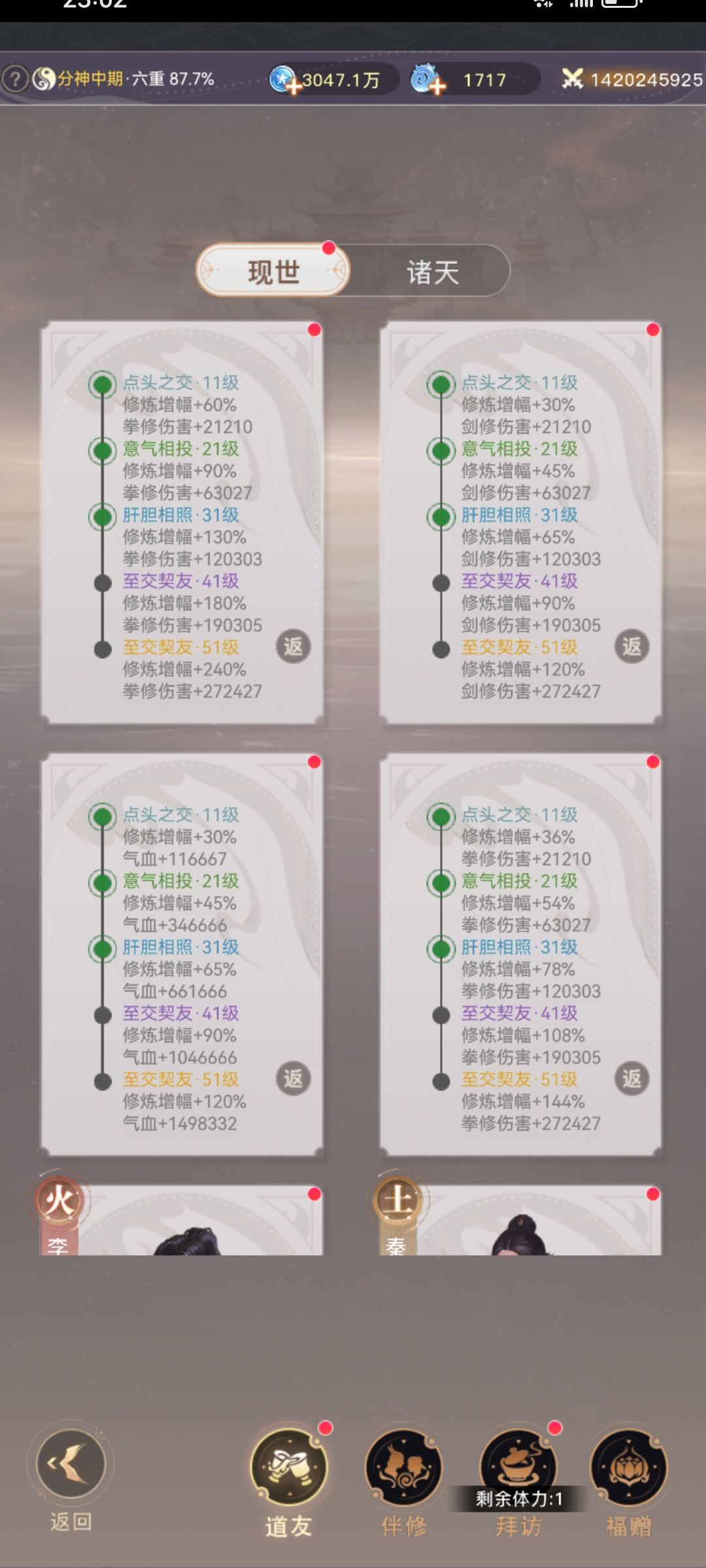 最后,解锁道友,升阶道友能获得基础属性加成和大量的修炼增幅。每位道友升阶后都能获得对应宝具,宝具碎片。圆满后还能解锁对应道友的头像。