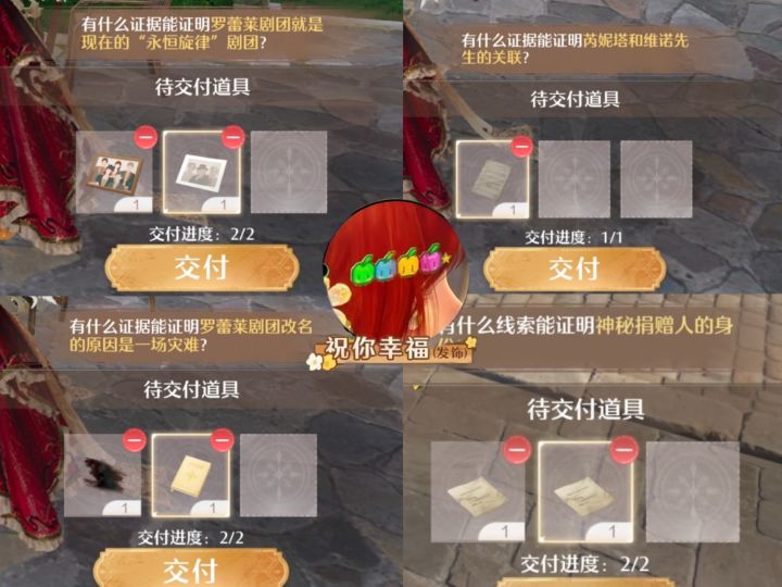 主线剧情提交线索:①提交两张合照,②提交“烧焦照片”和“剧院信息”③提交“过往的证词”音乐季提交道具和隐藏发卡速通攻略