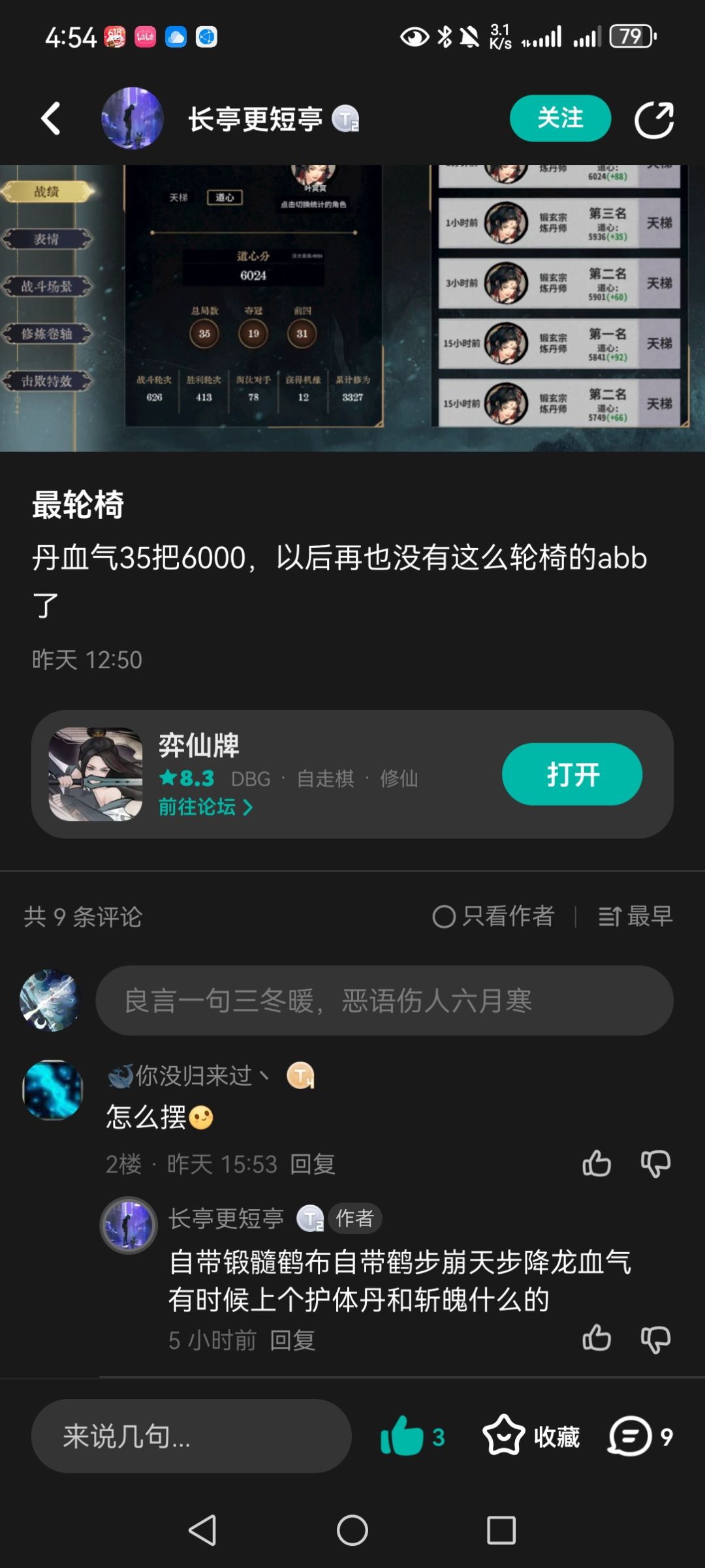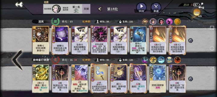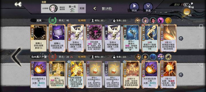 8轮元婴,最开始我选择是元婴之后每回合d干,效果并不理想,如果没有抽出双2级鹤步,等到10轮之后对手质量上来,凑不齐40身法,每轮d牌次数又少,所以说抽烂了很可能一泄千里。所以我现在的打法是8轮小d,有冥夜的存在abb的元婴期不会出现大败的情形,提供一下过渡思路: