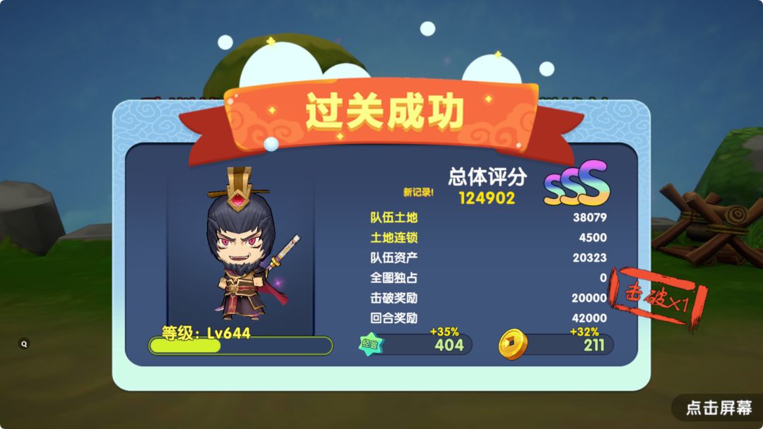 额外分数:即本关要做的任务。比如第一关任务为队伍土地,土地连锁,意味着本关土地分吃到四次加成,玩三征地角色先占满全部土地再破产为最高分。真董,袁术等。回合在15回合以内即可。