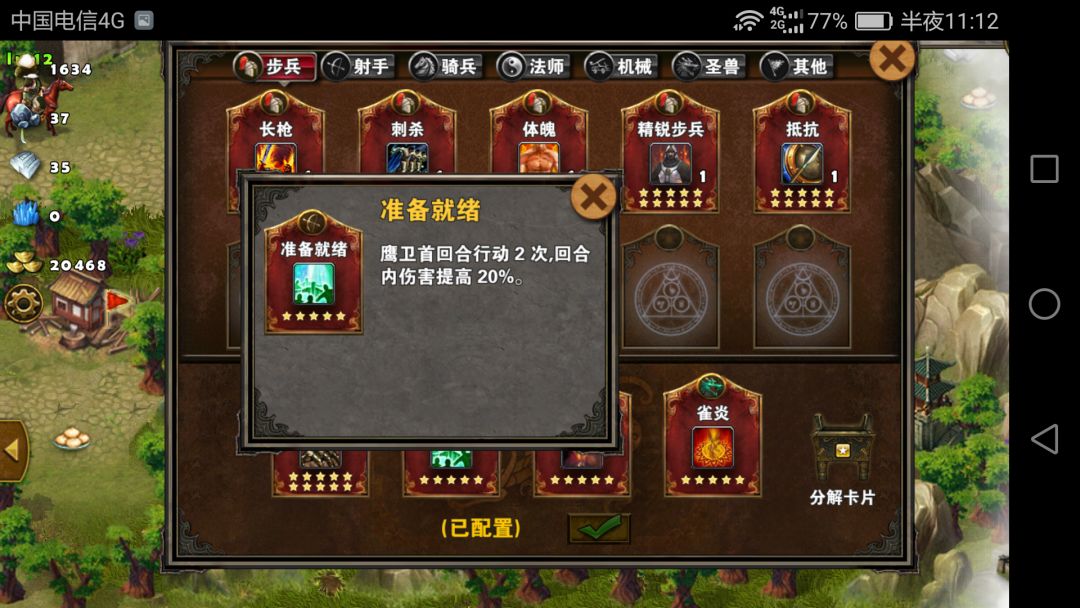 另外,地图前四章使用的兵种主要是鹰卫,使用的卡片用准备就绪和战前准备,支持鹰卫起手双动打出高额伤害,前几章只要是能攒兵的图,大多数使用这个套路,都能推的动。特别说明一下,鹰卫是用弓箭手升级的,装备飞鹰令后可升。