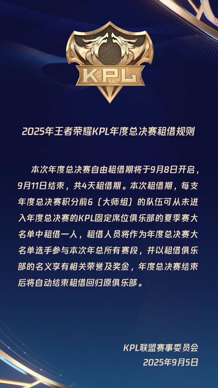 9月5日,KPL官方发布年度总决赛租借规则。具体规则如下: