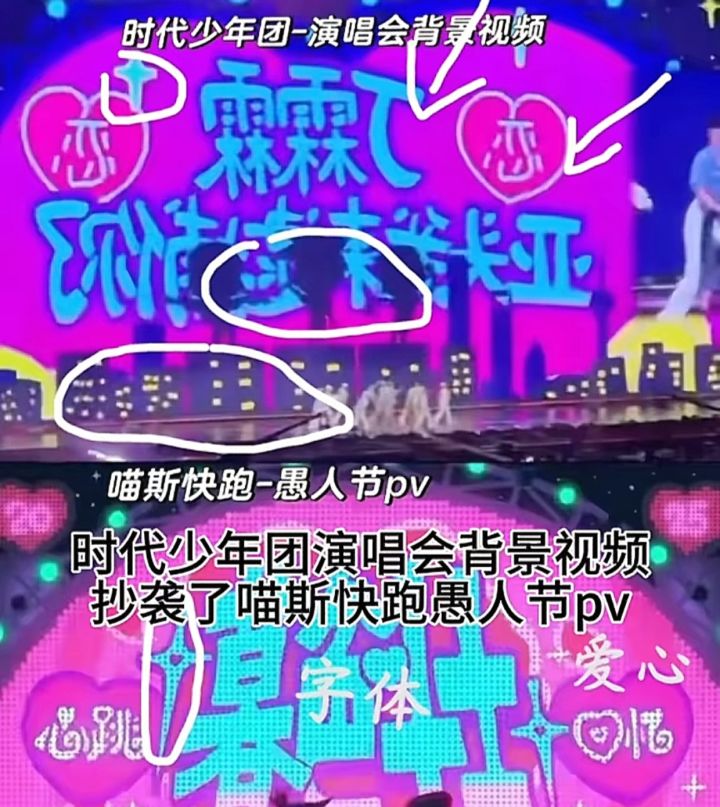 最近有玩家发现,时代少年团上海站《海芋恋》舞台的演唱会背景和喵斯快跑愚人节活动的角色形象几乎一模一样。
