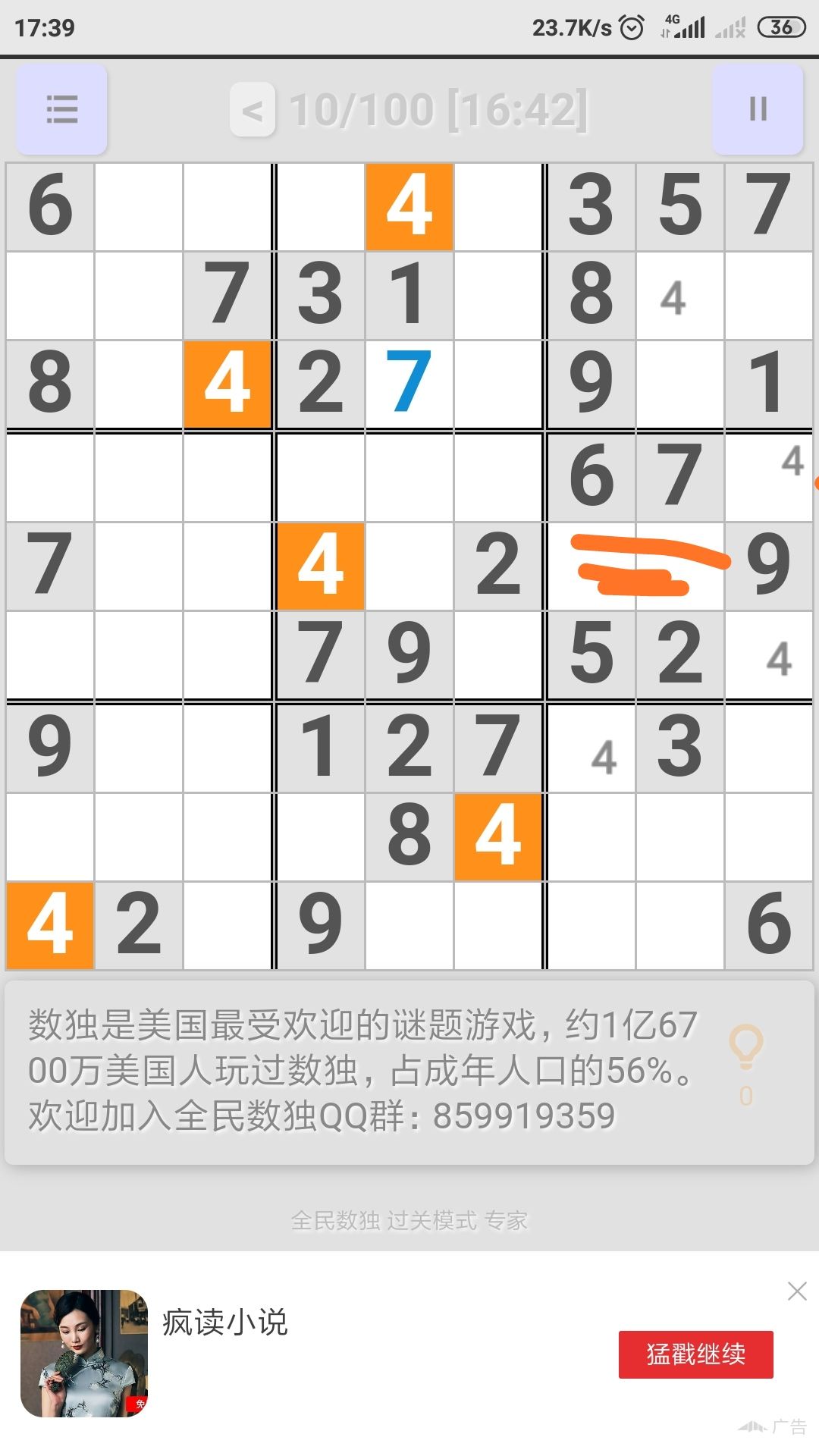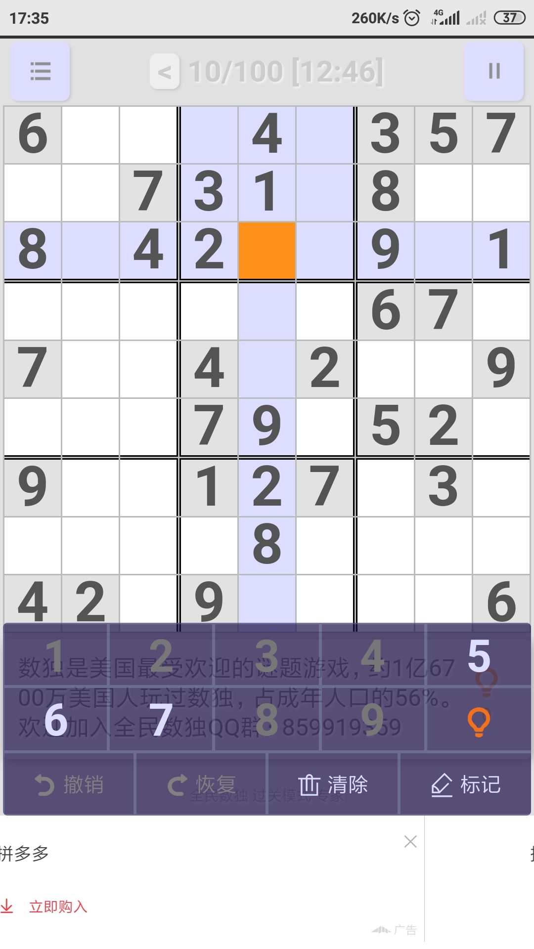 排除右中九宫格中2个格子,4并定在其他两格,然后他们与上面两个4排除右上九宫格其他三格,与下面两个4排除了右下九宫格的其他六格