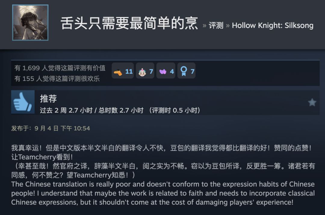 国区好评率56%,“褒贬不一”,主要问题集中在中文翻译,游戏本体的评价非常高。建议大家游玩时先做好准备,不要过于聚焦于翻译。