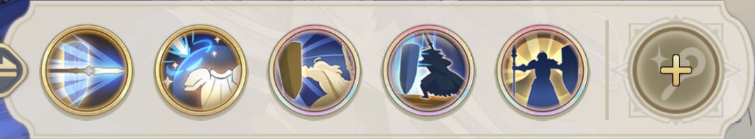 其中,“立盾·固战御敌”可以根据情况换成其他技能:偏向同阵营团队作战时,可换成大光环“勇气连心”;三星以下能量紧缺时,可换成被动“骑士信念”。