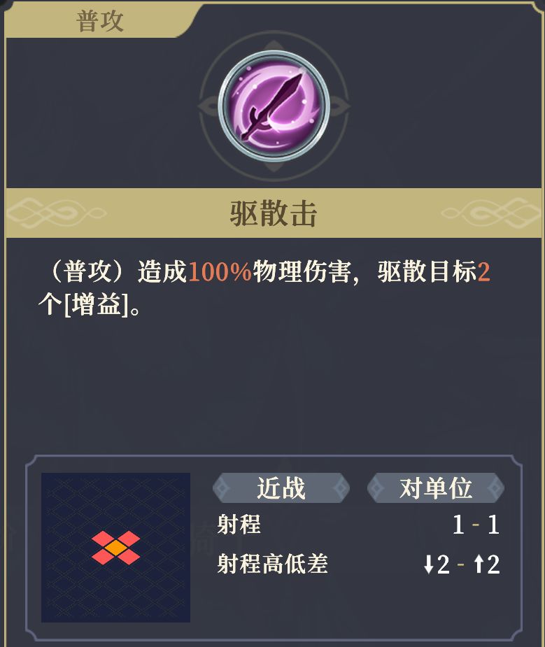 - 平平无奇的被动。使自身范围2格内其他友军攻击提高,不包括自己。