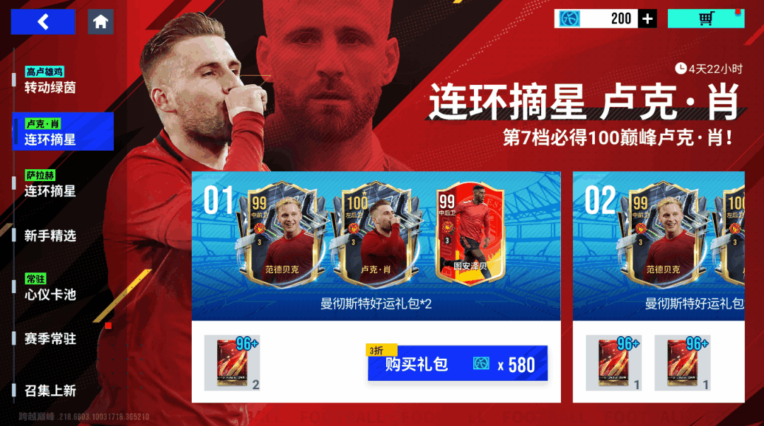 【连环摘星】卡池将于9月1日11时-9月8日11时期间,通过参与活动购买连锁礼包,有机会获取100潜力值巅峰卢克·肖、99潜力巅峰范德贝克!