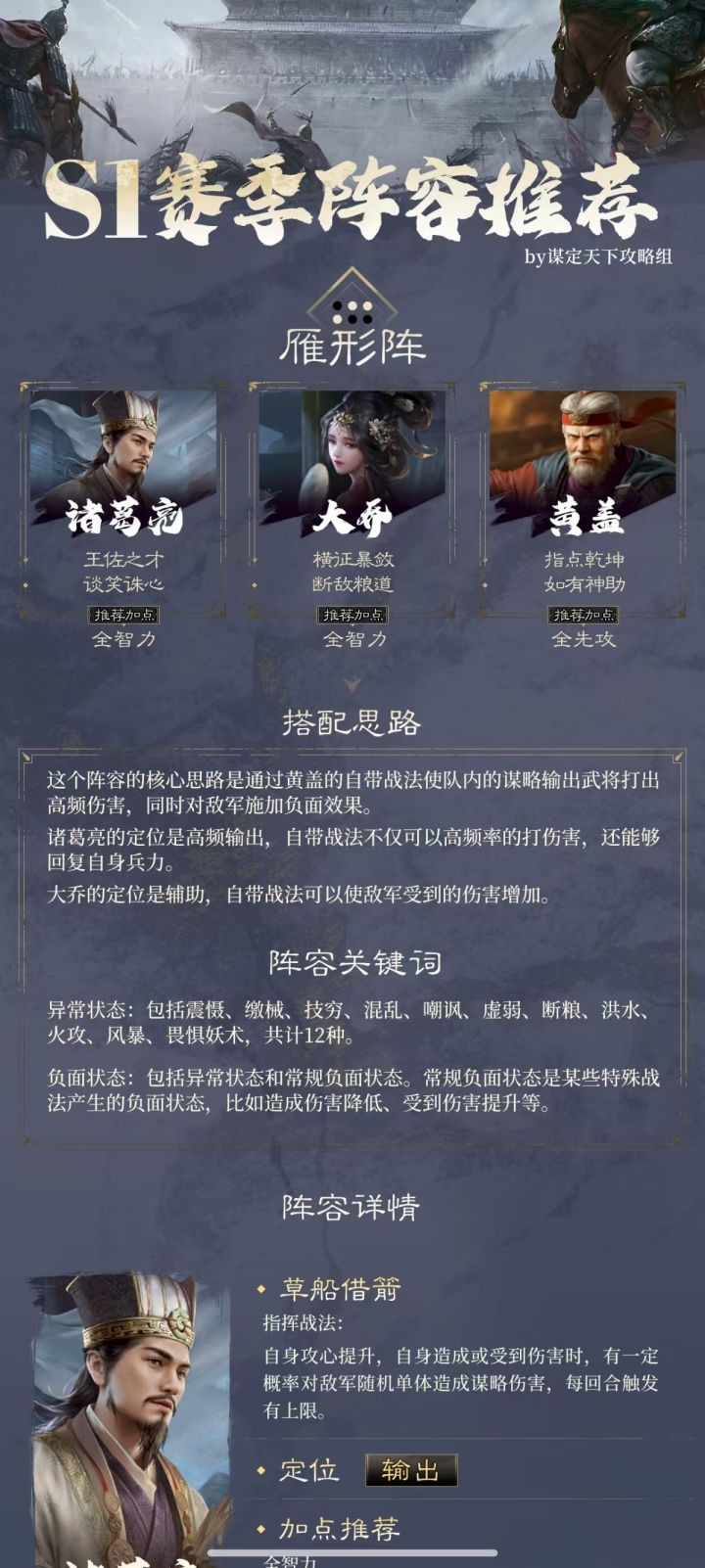 大家好,本期给大家分享的是,由“谋定天下攻略组”为大家带来的三谋S1赛季大黄诸阵容推荐,制作不易还请大家多多支持!