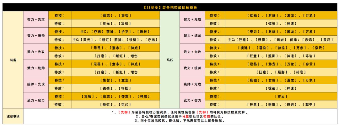 可以看到表格中,我们根据装备的不同属性,分别推荐了不同的最优解方案,主流的几种装备选择,基本都超不出这个范畴,如果觉得太麻烦,不想对照着看,那大家只需要记住几个经常出现的,例如先御、意志、打磨、灵光、君临、照影、游龙、疾驰、神速这九大词条。遇到务必谨慎分解。如果我们的卡池非常深厚,可以凑出先前我们阵容一图流中的主流阵容,那就很简单了,直接按照一图流中的装备推荐去保留即可。