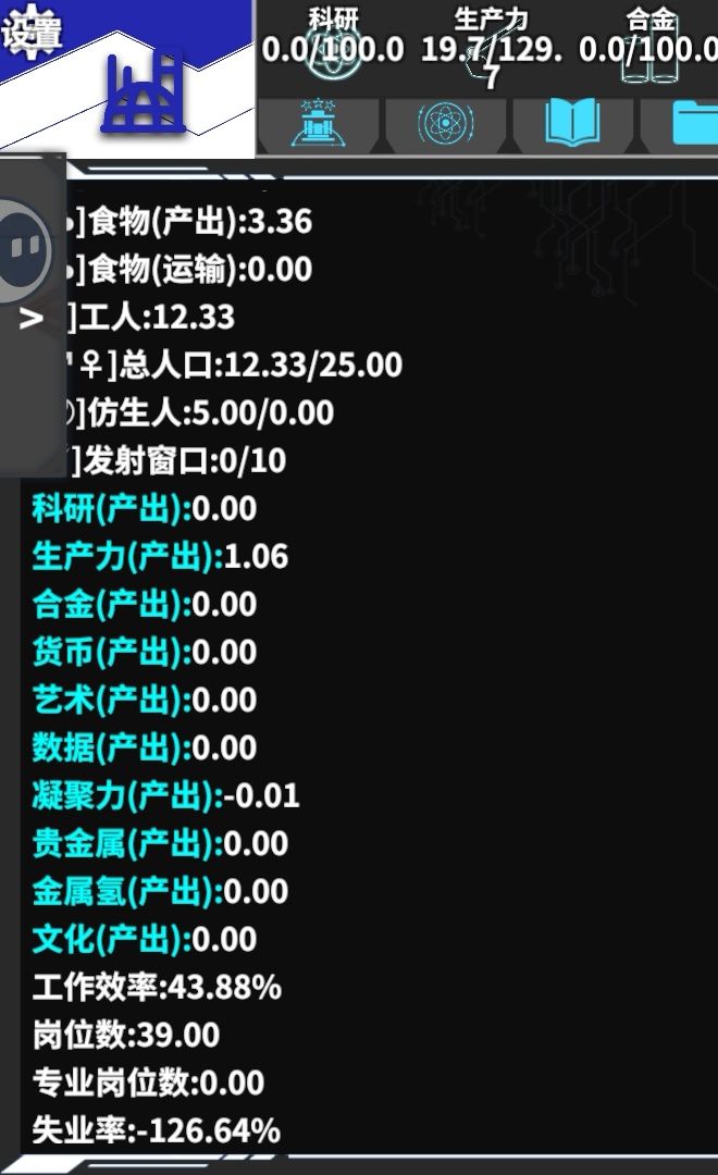 布局可能需要重排,右侧的三个图标挪动来左边(下方带有:0信息的图标)它们的数据信息显然会更长,适合放在它们左侧的那个区域。原本在该区域的信息(工人、岗位、工作效率、理论上限、工人不足)进行更改后移动到右侧区域。