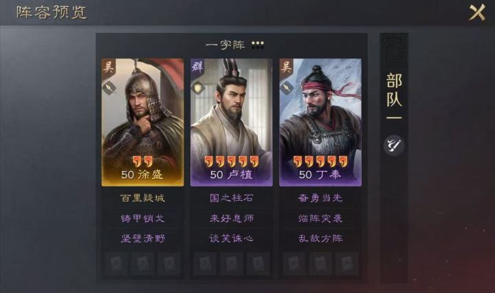 卢植可以为队伍提供【抵御】增加生存能力,【来好息师】配合一字阵使得全队都有稳定的恢复能力,【谈笑诛心】可以配合【坚壁清野】【临阵突袭】和【乱敌方阵】的负面效果补充队伍输出能力。