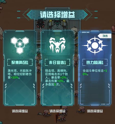 根据你已部署的炮塔类型,系统将提供多种随机增益,进一步强化特定流派。每次选择都可能彻底改变战局走向。
