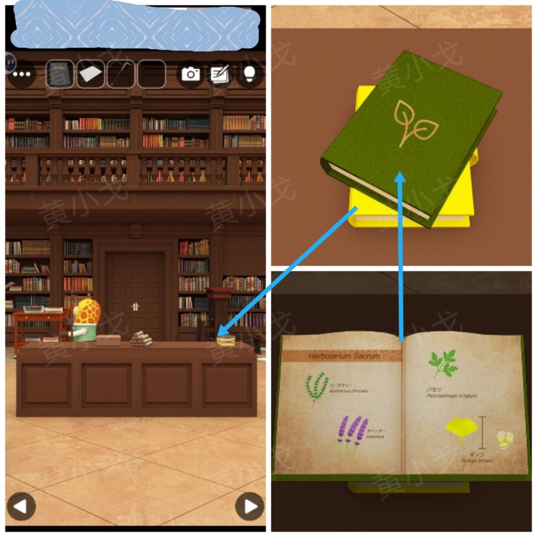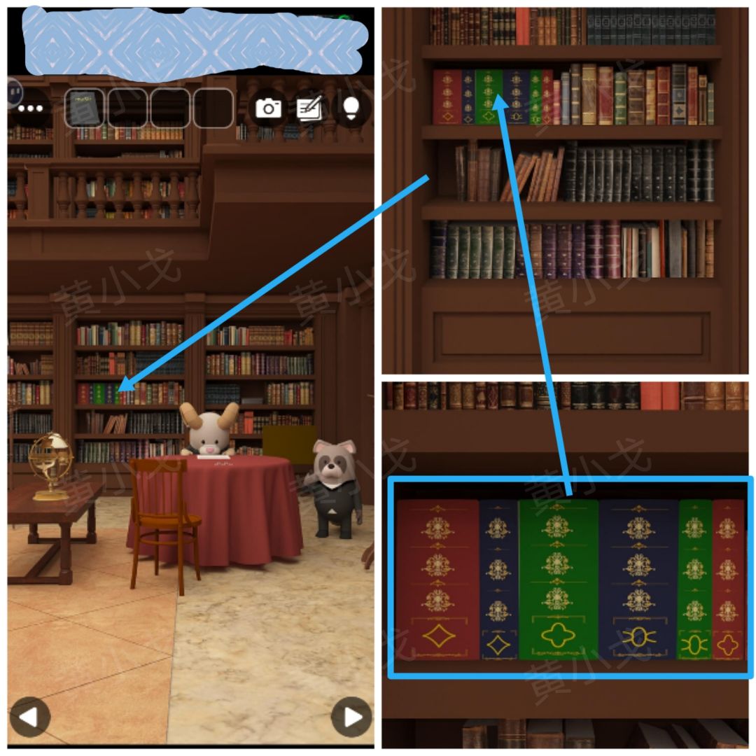6.点击中间的书柜,查看上面的书,获得线索