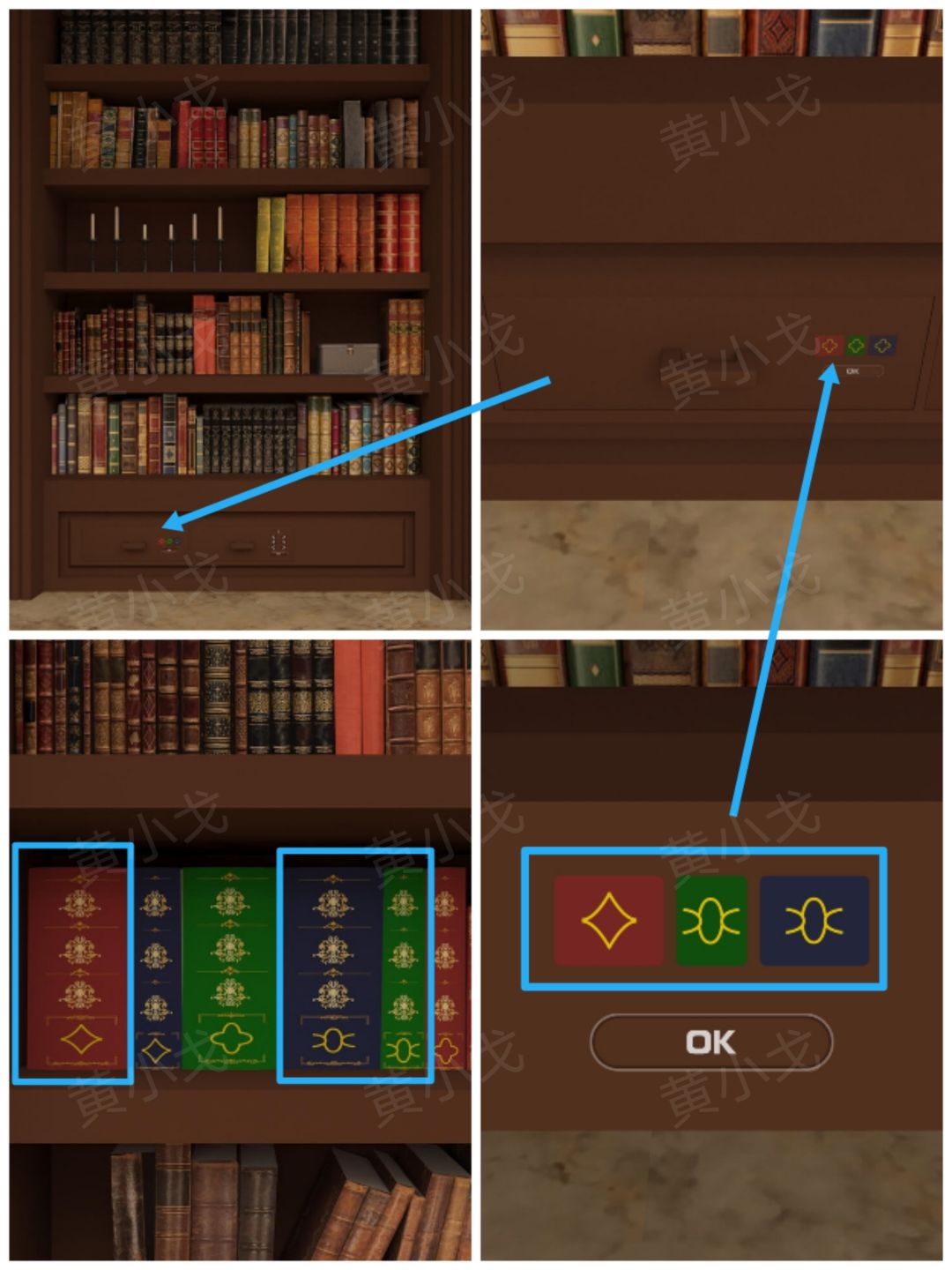 🔶书的位置及封面上宝石的颜色:左上-红、右上-绿、中-黄、左下-绿、右下-黄