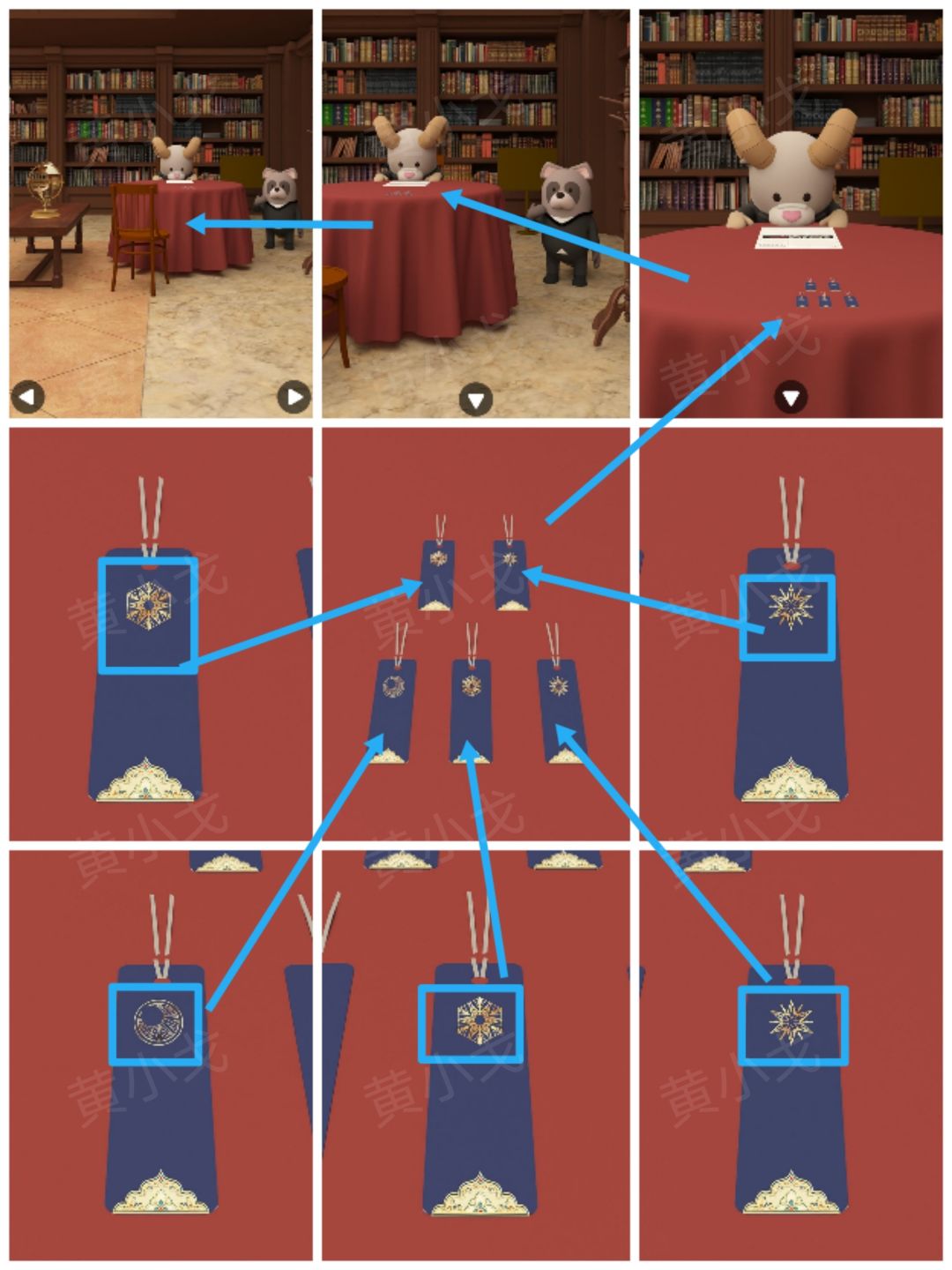11.点击书柜底下左侧柜门上的密码锁,根据输入框的颜色、大小提示,结合[圆桌]场景书柜上书的颜色及书脊上的符号线索,调整密码锁