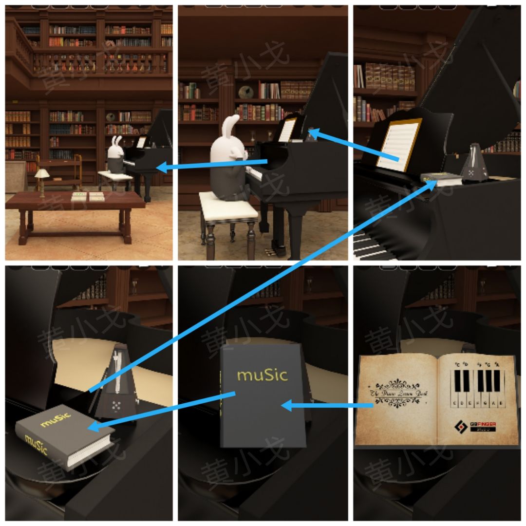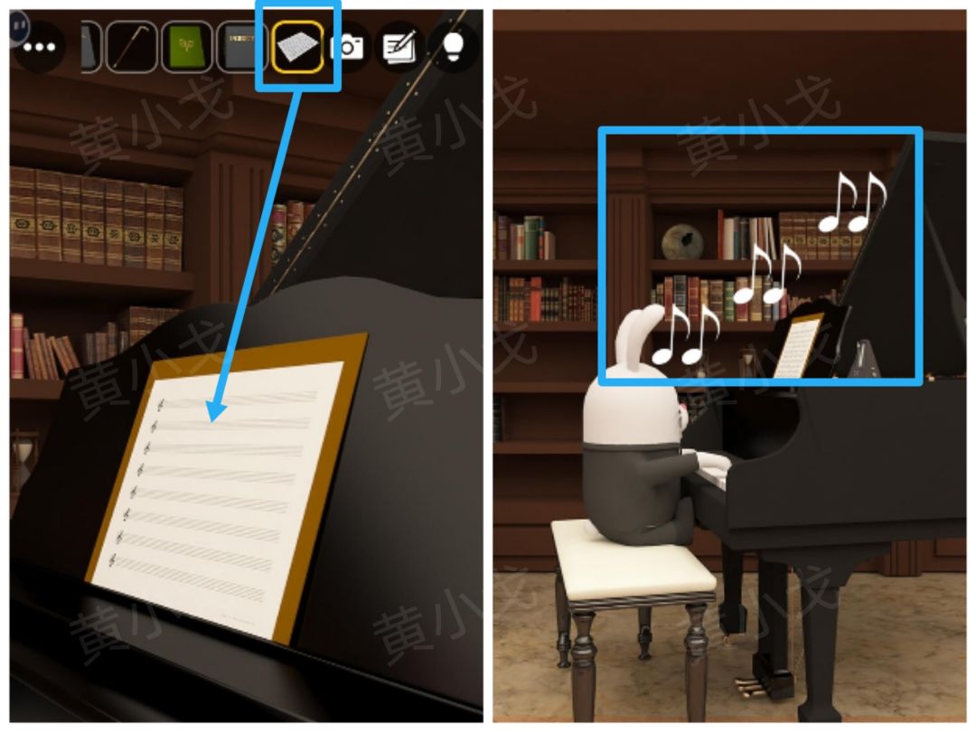 20.点击钢琴,放上【乐谱】;兔子弹琴,获得音符位置线索