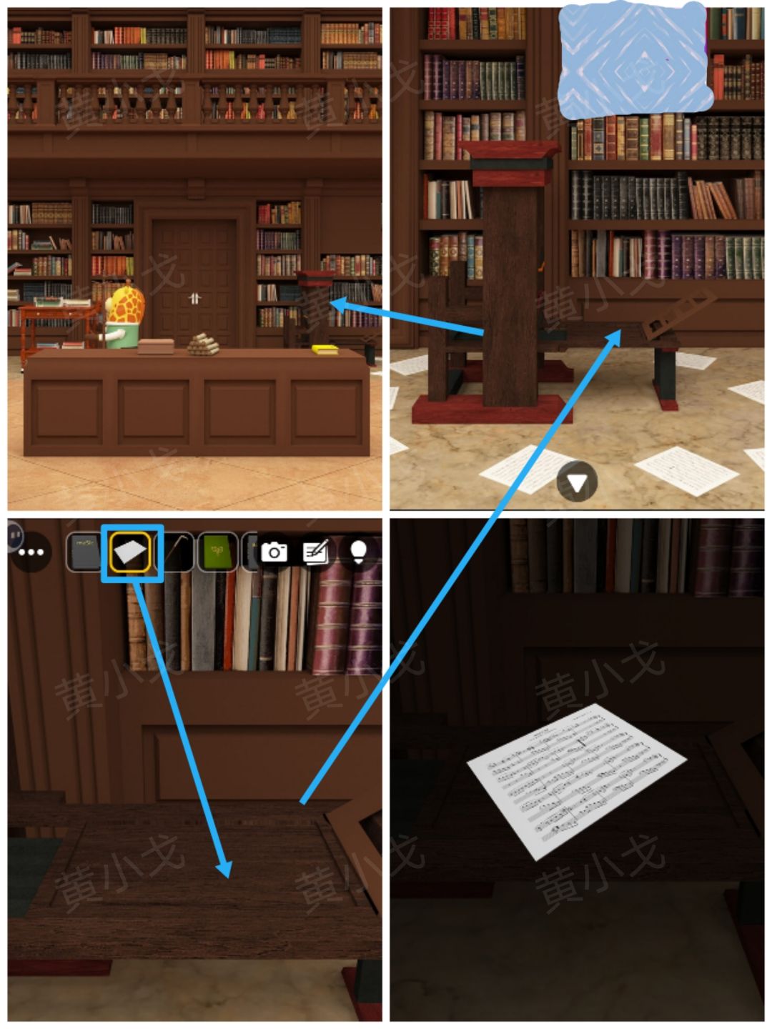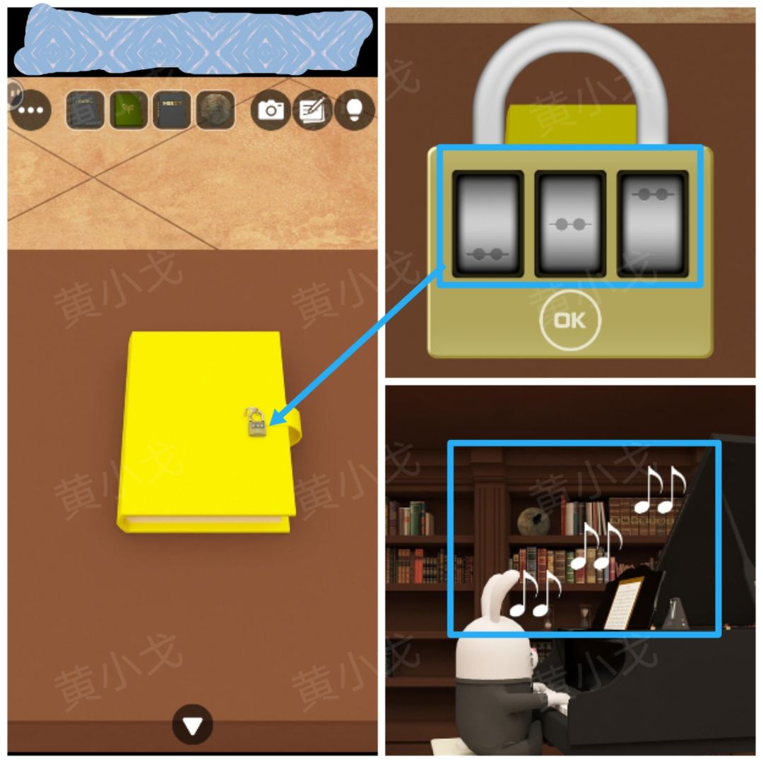 23.点击柜台上的黄色书上的密码锁,根据[钢琴]场景音符位置线索,调整密码锁