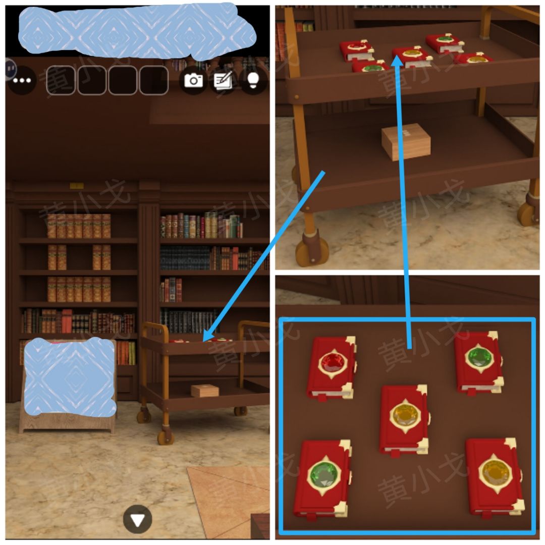 🔶推车上书的位置及封面上宝石的颜色:左上-红、右上-绿、中-黄、左下-绿、右下-黄