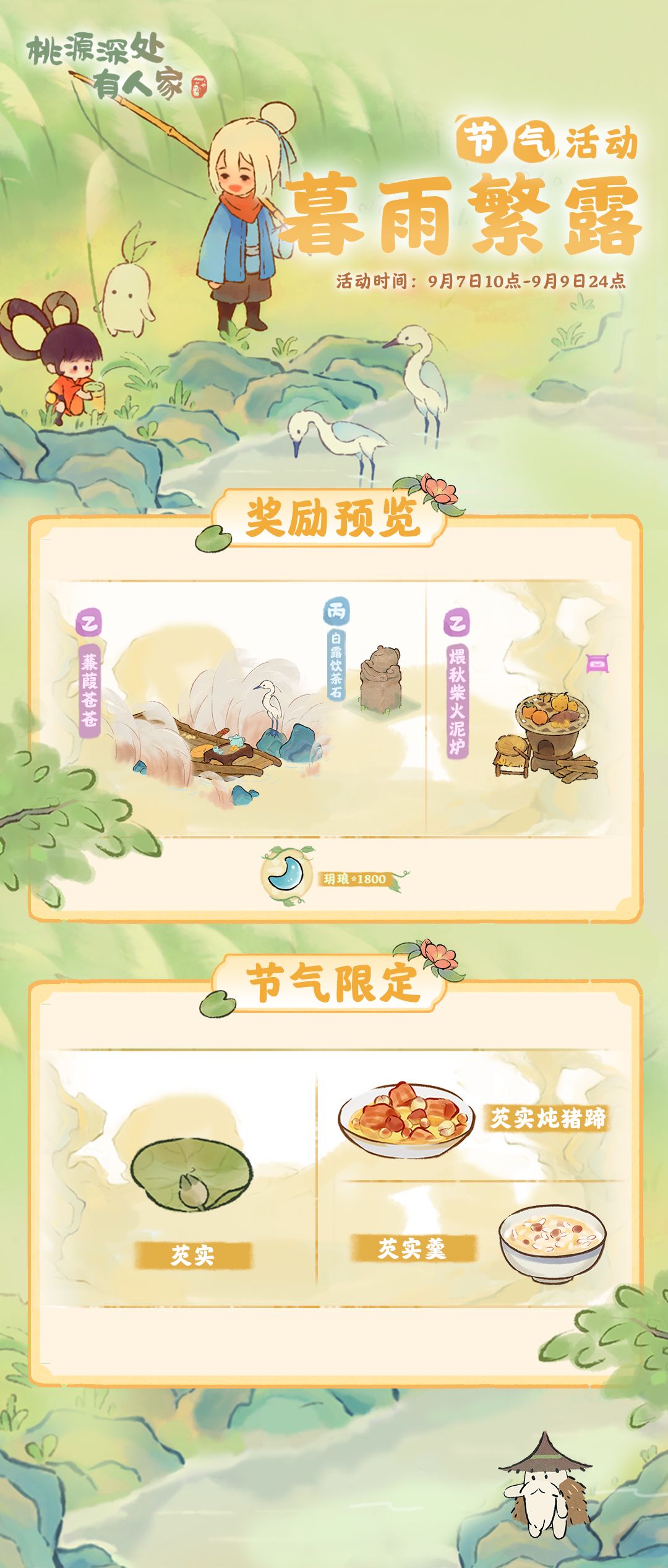 同时,装饰商店将上架秋季家居套装「千粟秋厢」中的「煨秋柴火泥炉」,并返场节气限定建筑「蒹葭苍苍」,山民们记得参与活动获取玥琅,不要错过兑换时间萝!
