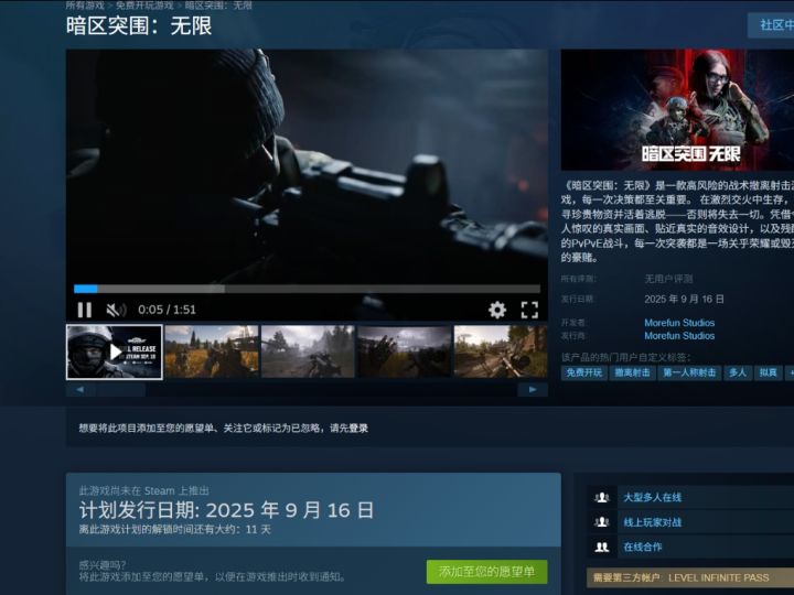 腾讯旗下的硬核军事模拟游戏《暗区突围:无限》正式官宣,将于 9 月 16 日开启全球公测。游戏将在 Steam 商店、Epic 游戏商城以及官方独立启动器同步上架,为玩家提供多样化的选择!