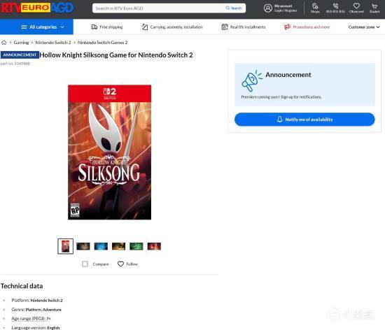 波兰连锁零售品牌RTV Euro AGD近日开放了《空洞骑士:丝之歌》Switch 2实体卡带版的预购,玩家可通过其官网查看产品详情并完成预订。并且爱喝粥简单的查了下,游戏发行方信息显示为CQE Poland——任天堂在波兰地区的长期官方合作伙伴。