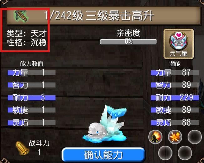 技能树左上角学习暴力重击,第一个技能的等级无所谓。完事之后继续学,如果随到3级及以上的暴击高升就可以拿去练了(最好还是4级及以上,笔者练过一只3级的最后9升10磕了15瓶生命药),出了其他的技能或者1级2级的暴击高升直接放生即可。