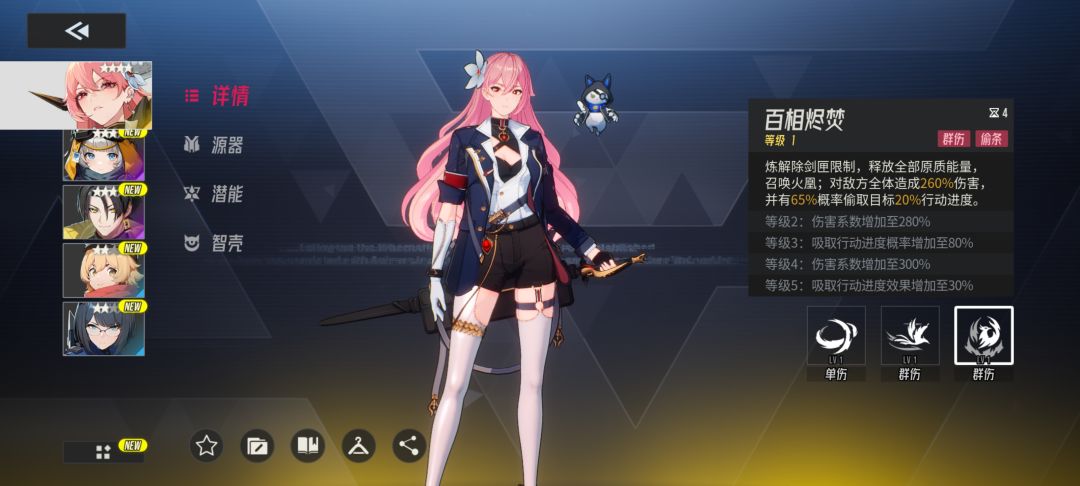 最后是百相烬焚,终极群伤加“偷条”技能,对敌方全体造成高额伤害,还有大概率偷取目标行动进度。关键时刻放出来,不仅能打残一片敌人,还能打乱敌方节奏,让我方更快行动,奠定胜局。