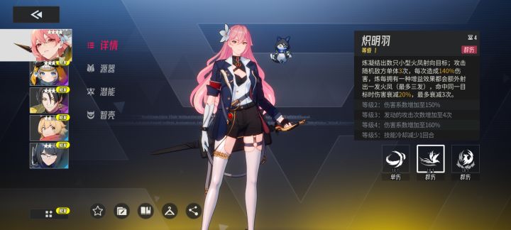 再看炽明羽,群伤技能,能凝结出小型火凤攻击随机敌方单体多次,每有1种增益效果还能额外射出火凤,不过命中同一目标伤害会衰减。所以在有多种增益的时候用,能最大化输出,清杂兵或者打多个敌人都很合适。