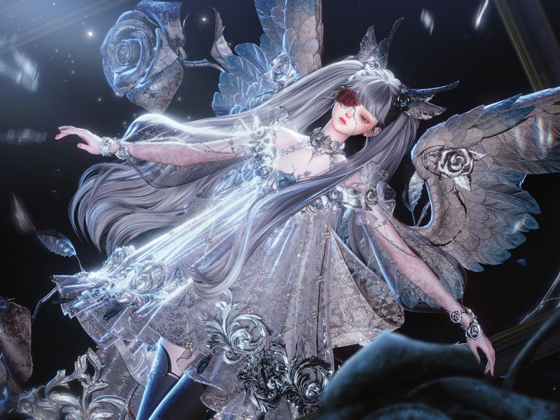 作为整套时装的视觉基石,我们精心雕琢石膏部分,赋予其厚重坚硬的质感,花瓣边缘甚至带有被风化的、粗糙的痕迹,透露出时间在物体表面停留形成的沉淀感。而连衣裙我们则选用了极尽轻盈飘逸的薄纱。当角色移动时,坚硬的石膏与飘逸的纱裙形成鲜明对比,仿佛是挣脱了石化的禁锢,获得了新生的自由,带来极富美感与对比的视觉体验;