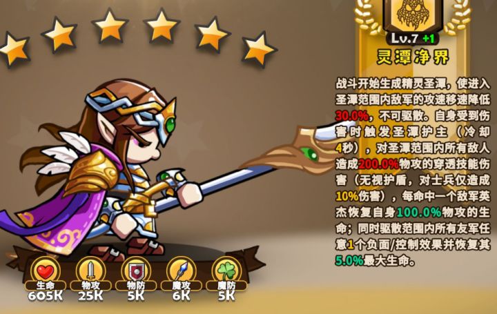 1. 战斗开始生成精灵圣潭,使进入圣潭范围内敌军的攻速移速降低30%,不不驱散。自身受到伤害时触发圣潭护主(冷却4秒)。对圣潭范围內所有敌人造成伤害;